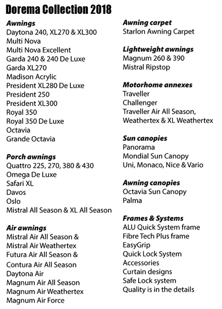 Click the Dorema catalogue cover image above to download the current brochure. Or phone North Coast Caravans now 01288 359 365